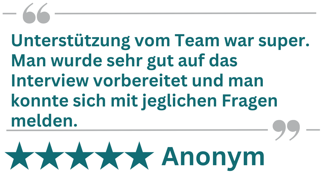 Transparenz über den Status Quo sowie regelmäßige und schnelle Rückmeldung im Bewerbungsprozess ist unser Qualitätsversprechen an Sie. Persönlich begleiten Sie feste Ansprechpartner:innen im gesamten Bewerbungsverfahren, geben Ihnen ein konstruktives Feedback und unterstützen auch mit Benchmarkwissen.